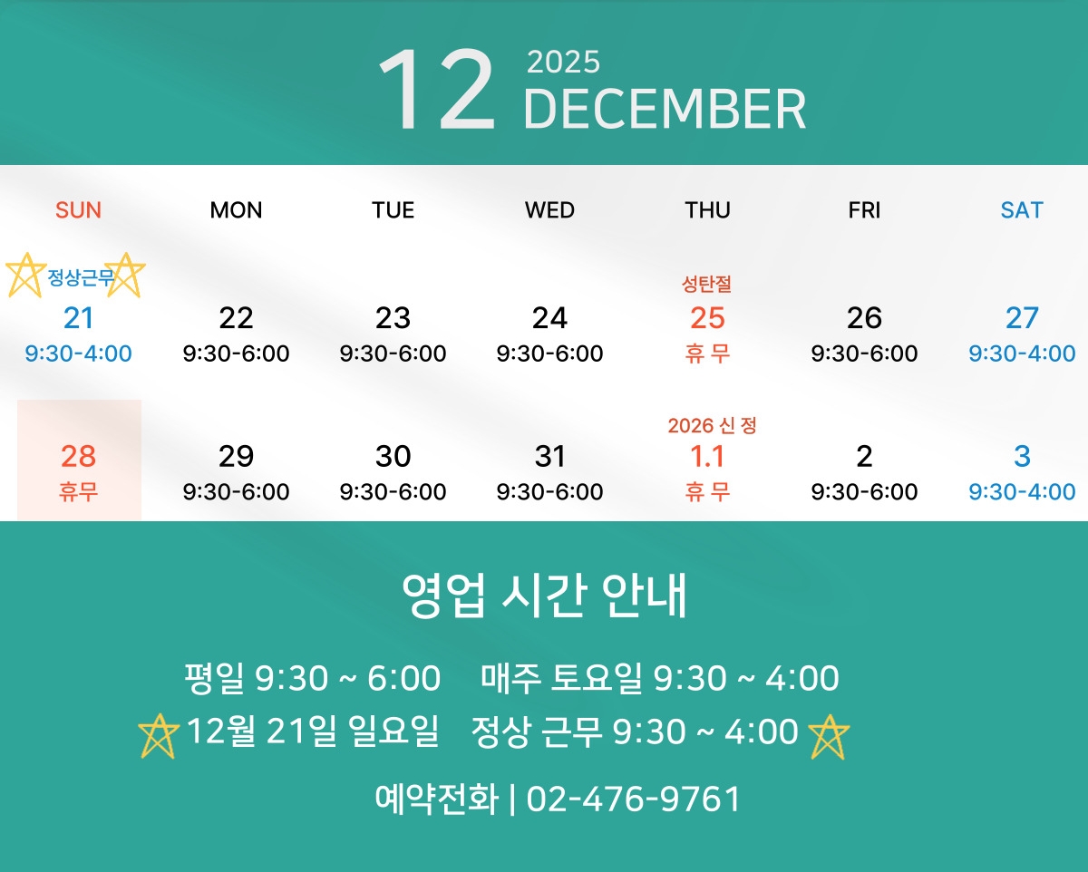 예약 없이 방문하실 경우 예약자 우선으로 진행하기 때문에 대기 시간이 길어질 수 있습니다. 점심시간은 따로 없습니다.