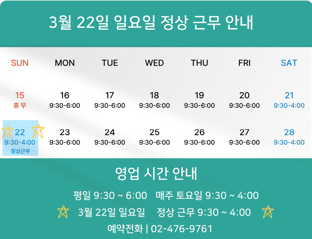 - 평 일 : 오전 9시 30분 - 오후 6시